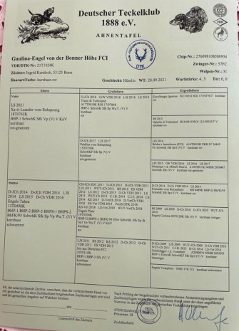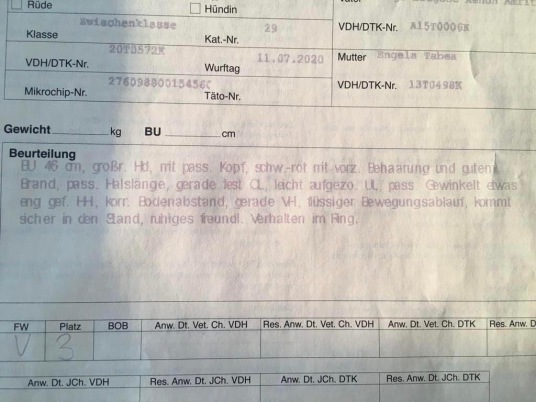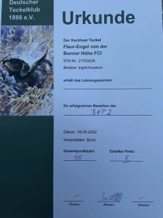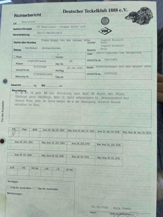 Unsere Jüngste, meine Urenkelin, Fleur-Engel vd Bonner Höhe, hatte nicht ganu so viel Glück, dennoch kann sich ihre Beurteilungen sehen lassen, auch darauf sind wir stolz.