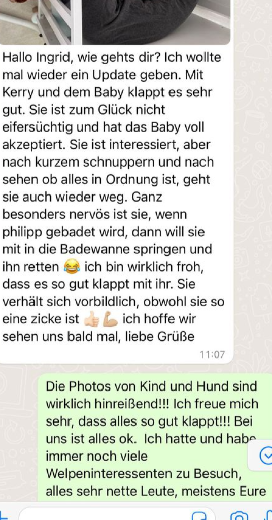 Wir freuen uns alle riesig, dass die Hündin so ein schönes Zuhause gefunden hat. Es war eigentlich Zufall. Die Freunde wussten gar nicht, dass es ein Engels Hund war, aber die Ähnlichkeit mit plato hat sie unbewusst angesprochen. Monate später erhielten sie die Ahnentafel und haben mich dann sofort kontaktiert.