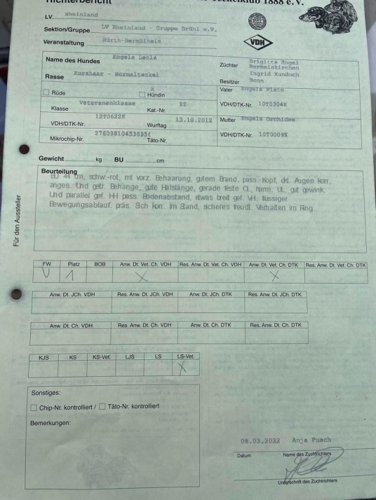 Vorzüglich erhalten. Mit Bravour hat sie ihre erste Show gemeistert und hat dem Vortrag des Richters über Kurzhaarteckel in einwandfreiem Stand gelauscht. Der Richter, Herr Klümper, war begeistert von ihr und sogar Ingrid bekam ein Lob für die einwandfreie Präsentation.