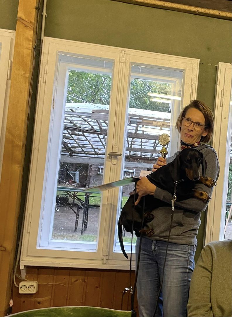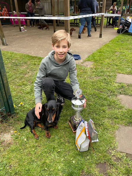 Meine Enkelin Eika-Engel wurde schönster Teckel der Gruppe Bonn. Sie bekam ebenfalls eine hervorragende Beurteilung und wurde routiniert von ihrem jungen Führer Jan (12 Jahre) vorgeführt.