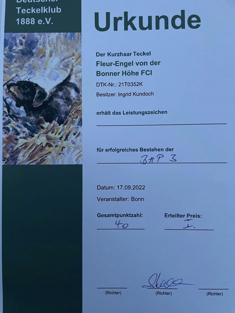 Unsere Jüngste, meine Urenkelin Fleur-Engel hat, nachdem sie vor zwei Wochen bereits die BHP1 im ersten Preis bestanden hatte, hat nun auch die BHP 2 im zweiten und die BHP 3 im ersten Preis bestanden.