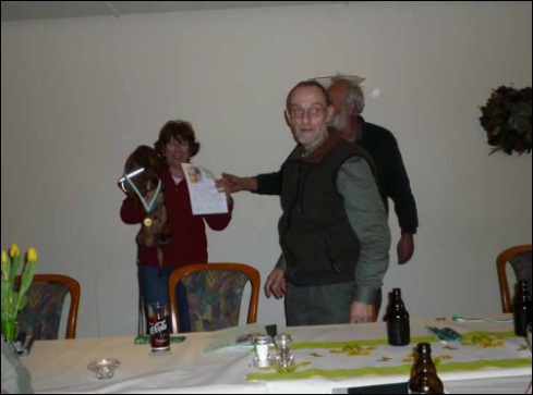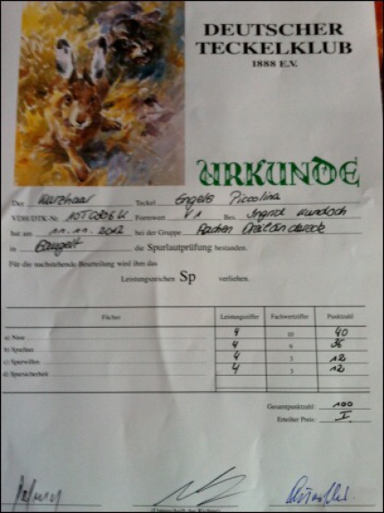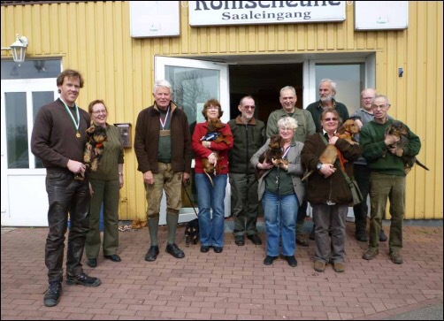Der 6.10.2012 war wieder ein großer Tag für mich. Ich war zur Vielseitigkeitsprüfung angemeldet und habe sie doch tatsächlich bestanden. Es hat den ganzen Tag fast nur geregnet, nein es hat geschüttet und es ist beinahe ein Wunder, dass wir 4 Hunde die Prüfung gemeistert haben. Am schlimmsten war die Schweißarbeit, die Fährte war kaum zu erschnüffeln und so haben wir alle diesen Teil nur im 3. Preis gemacht. Ingrid und Brigitte, die mich wieder sehr bei meiner Arbeit unterstützt hat, waren aber trotz allem sehr glücklich und ich bin mehr als froh. Es war fast unmenschlich. Nachmittags hat es kaum geregnet und es gab viele Hasen, sodaß dieser Teil der Prüfung recht angenehm war. Das Beste war natürlich für unsere Führer und die Richter die Preisverleihung in der Hütte des Jagdpächters. Der Bollerofen lief auf Hochtouren, die Kleider trockneten wieder und es gab eine herrliche Wildschweingulaschsuppe, wunderbaren Kuchen und einen heißen Kaffee. Dank an Karin Neuser, die alle diese Köstlichkeiten organisiert hatte und Dank an Richter und Prüfungsleiter, die uns ermutigt haben durchzuhalten und nicht aufzugeben!