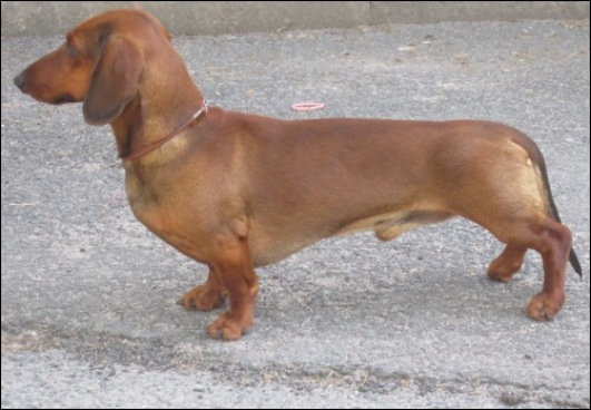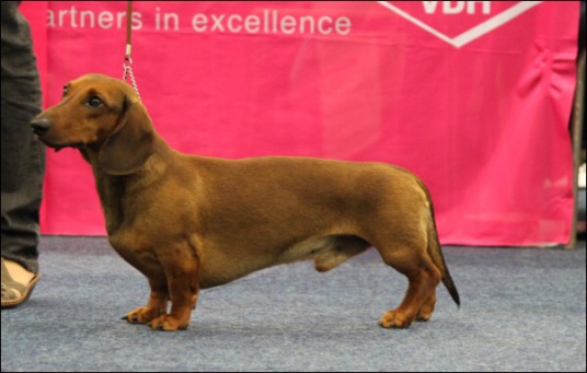 Kräftiger substansvoller Rd, sehr schöner Kopf, dunkle Augen, langer Fang, allerbeste Rückenlinie, idealer Bodenabstand, gut geführte VH u. HH , raumgreifendes Gangwerk, vorbildlich im Stand,