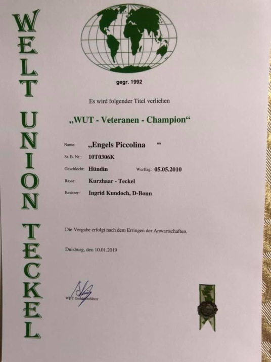 Ingrid ist mächtig stolz auf uns. Meine Schwester und meine Wenigkeit sind WUT-Veteranen-Champion. Es macht uns immer noch großen Spaß und Freude, im Ausstellungsring zu laufen.