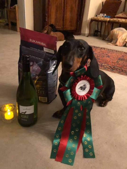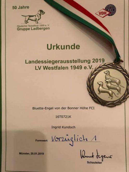 Meine Schwester Engels Tabea erlief sich ein V1 VDH CAC/ DTK CAC Res. und meine Enkelin Bluette-Engel von der Bonner Höhe hat ein V1 VDH CAC erhalten. Die Beurteilungen waren hervorragend und die Richterin sehr angetan von den beiden Damen. Jeder Richter hat bis jetzt immer den super Pflegezustand von Ingrids Teckel gelobt. Das macht uns alle sehr stolz.