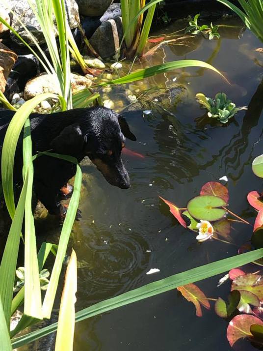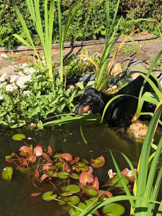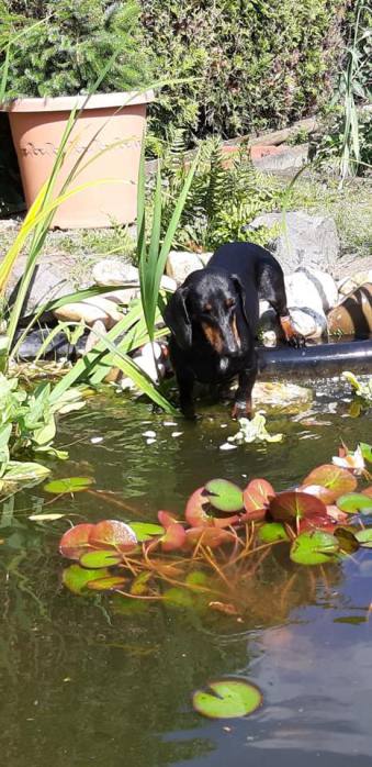 Meine Tochter, Engels Tabea hat heute ihren Sohn, meinen Enkel Clemens von der Bonner Höhe - Sohn von Xenon Amphitrion - besucht. Der junge Mann ist zu einem sehr schönen Jungteckel herangewachsen, seiner Mutter und auch seiner Großmutter Isis aus Dörnchen aus dem Gesicht geschnitten und sehr liebenswürdig. Leola hat im Gartenteich Jagd auf Fische , Frösche und Seerosen gemacht. Sie war absolut in ihrem Element.