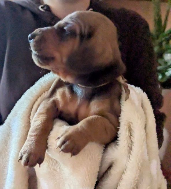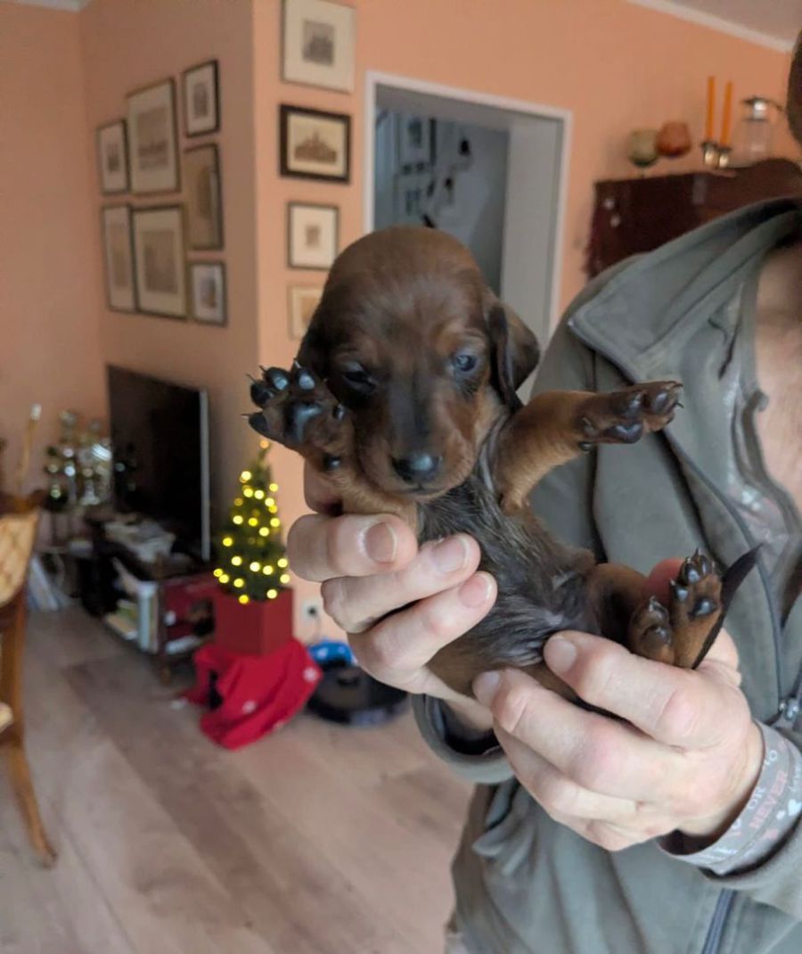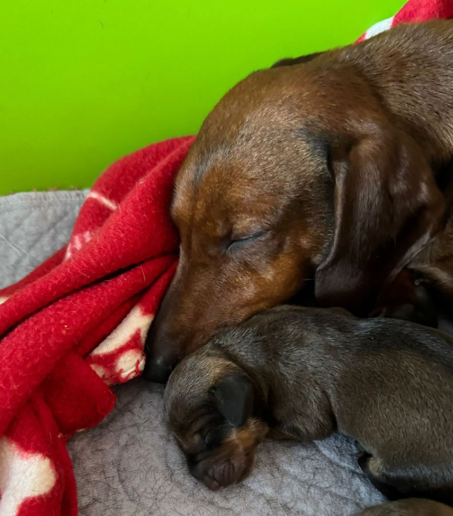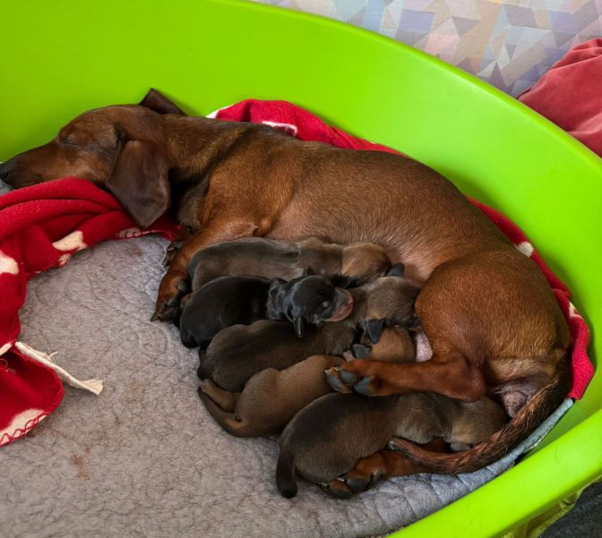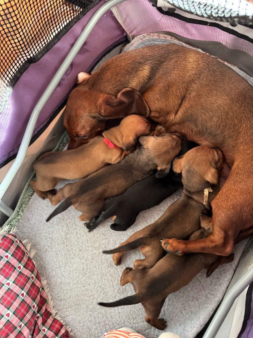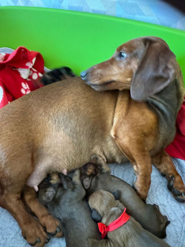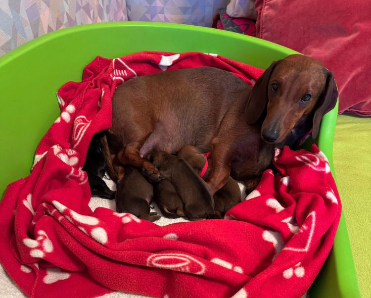 Welpen geworden, 3 Rüden und 2 Hündinnen. Vier sind rot und eine Hündin schwarz rot. Es war eine aufregende Nacht und ich danke meiner Freundin Anke Marchand und meiner hervorragenden Tierärztin Frau