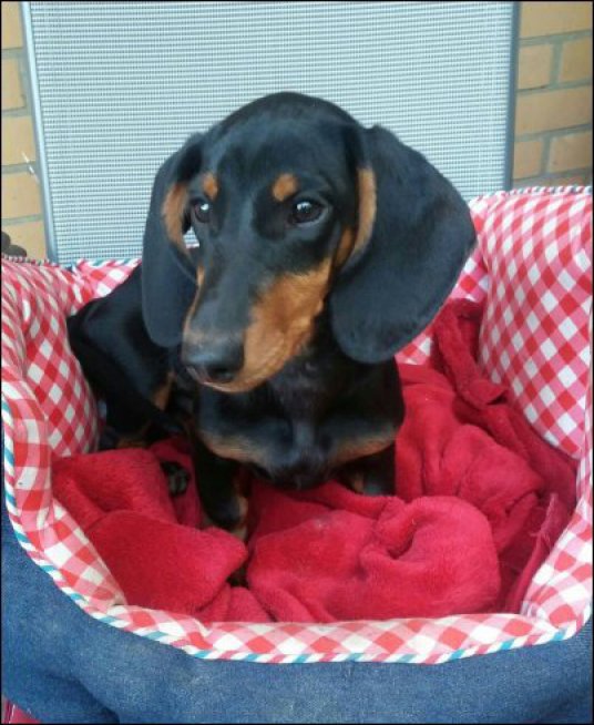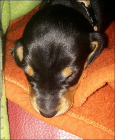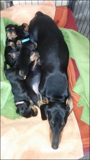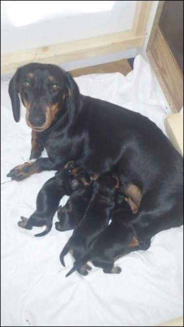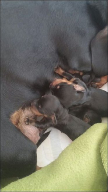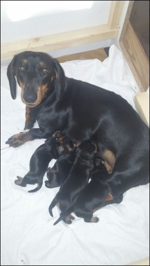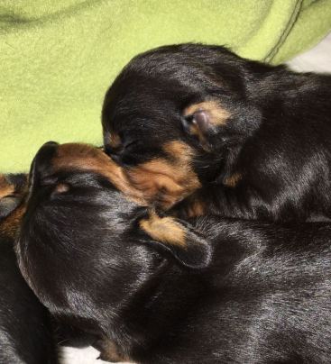 Unsere Welpen sind geboren. In der Wurfbox liegen 3 Rüden und eine Hündin in schwarz-rot.